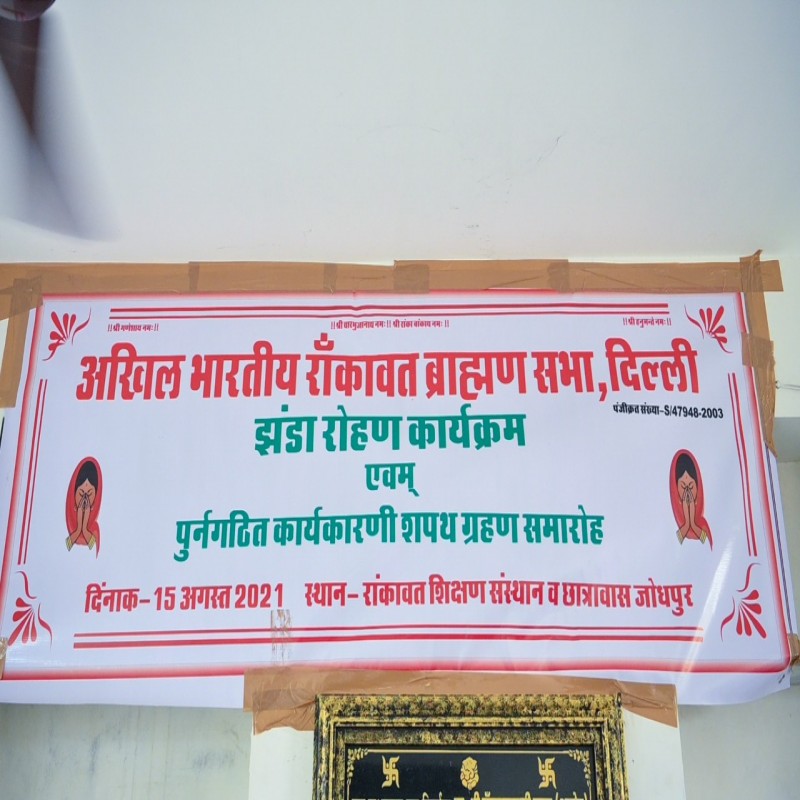 रांकावत समाज की सर्वोच्च संस्था अखिल भारतीय रांकावत ब्राह्मण सभा, दिल्ली के राष्ट्रीय अध्यक्ष श्री मुकेश के व्यास ने छात्रावास भवन पर भव्य झण्डारोहण अपने कर कमलों द्वारा किया | झण्डारोहण के सहयोगी बने सर्वश्री सुरेन्द्र स्वामी, राजेन्द्र गोयल,रतन दास माधावत एवं देवदास शर्मा तथा सैकड़ो की संख्या में इस सम्पूर्ण समारोह में भारतवर्ष की संस्थाओं से पधारे गणमान्य पदाधिकारियों अध्यक्षों, पूर्व राष्टीय अध्यक्षों, सलाहकार मण्डल व सभा की कार्यकारिणी के पदाधिकारियों, समाज के गणमान्य व्यक्तियों तथा महिला शक्तियों की गरिमामयी उपस्थिति रही |